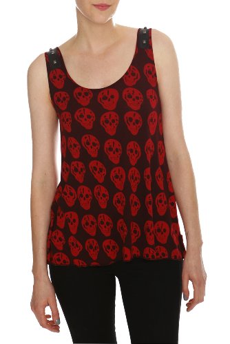 This black tank top features an allover red skull print with faux leather and pyramid stud accented shoulders.